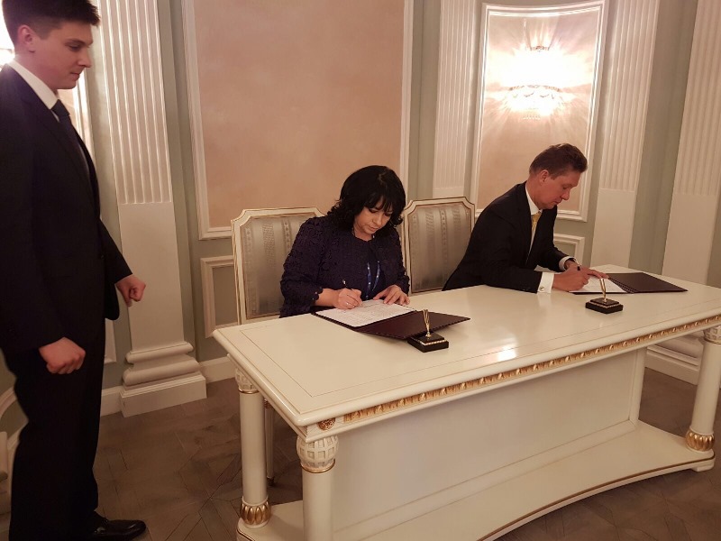 Председателя на Управителния съвет на ПАО "Газпром" Алексей Милер с Министъра на енергетиката на Република България Теменужка Петкова